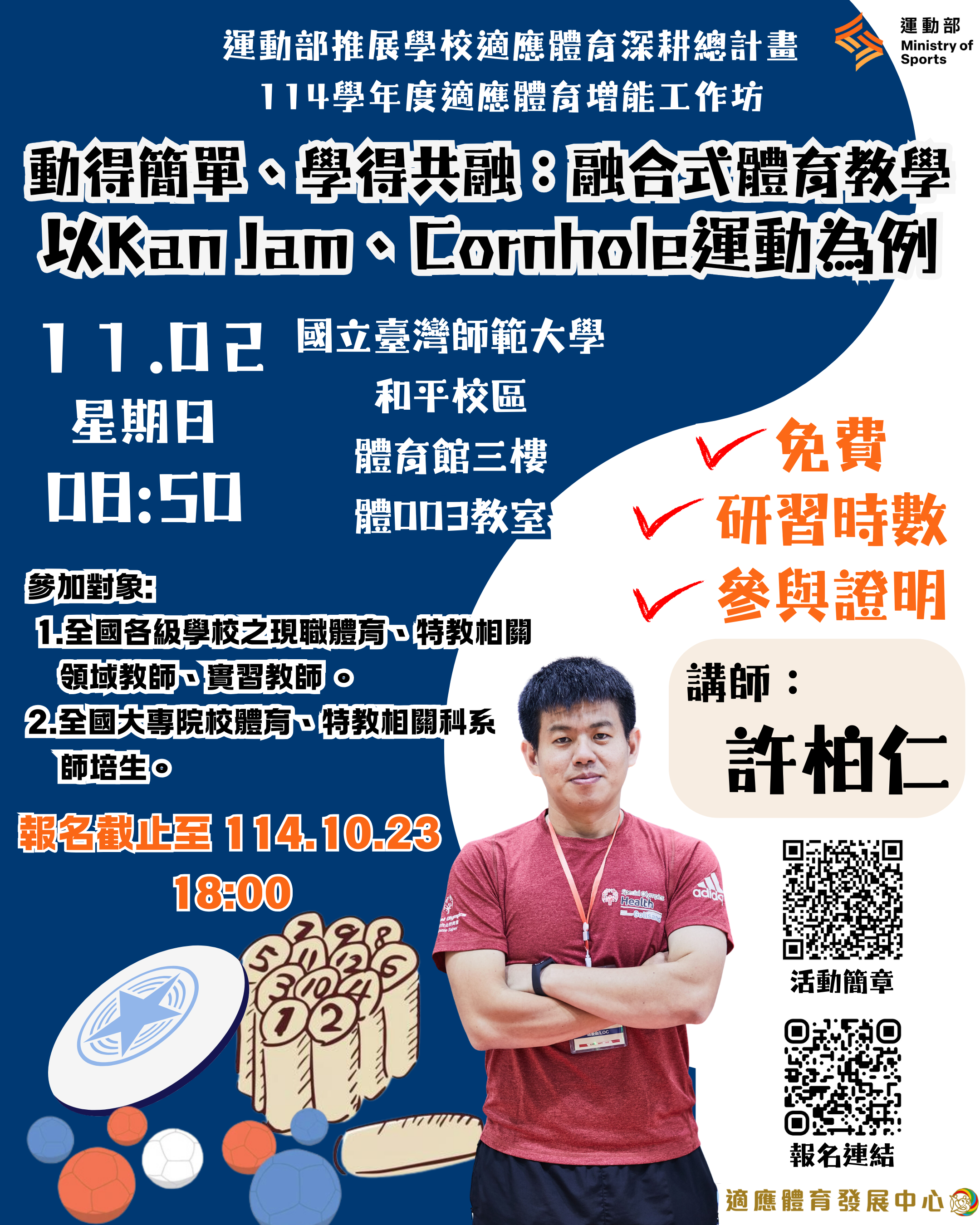 【轉知】運動部委請國立臺灣師範大學辦理「114學年度適應體育增能工作坊─動得簡單、學得共融:融合式體育教學,以Kan Jam、Cornhole運動為例」